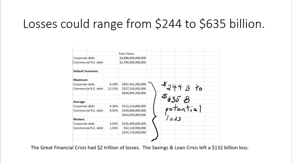 The estimated losses, ranging from $244 to $635 billion, will be mitigated to the extent that refinancing and rehabilitation activities succeed. Unfortunately, there are limits to remediation since some of the assets in question have suffered irreparable diminution in value, such as B-grade downtown office properties.