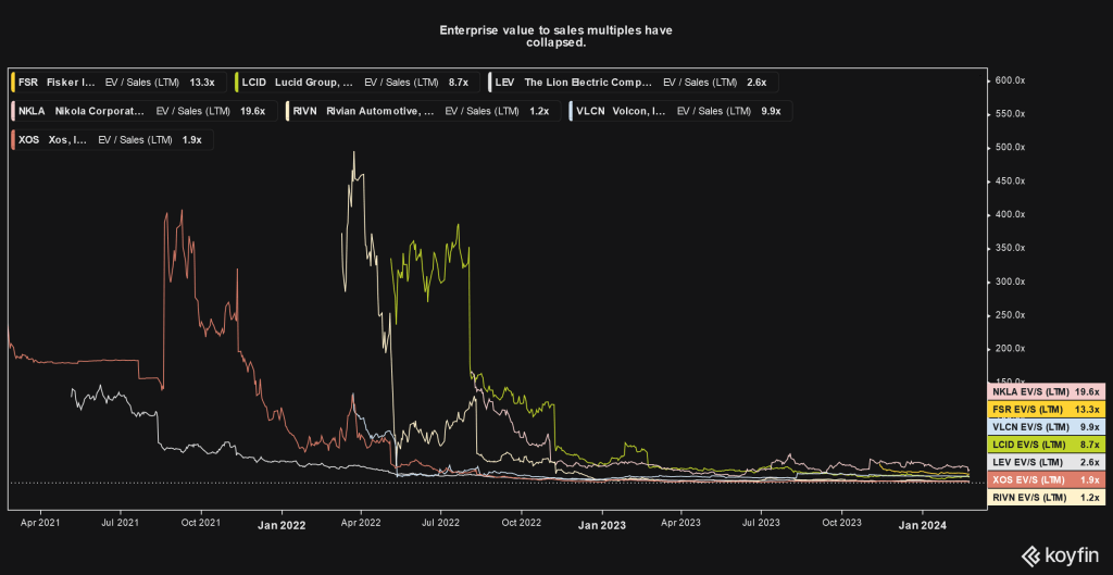 Valuation multiples have collapsed in the wake of the near term limited market opportunity for electric vehicles.
