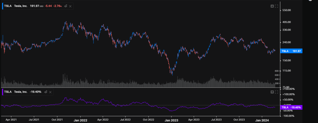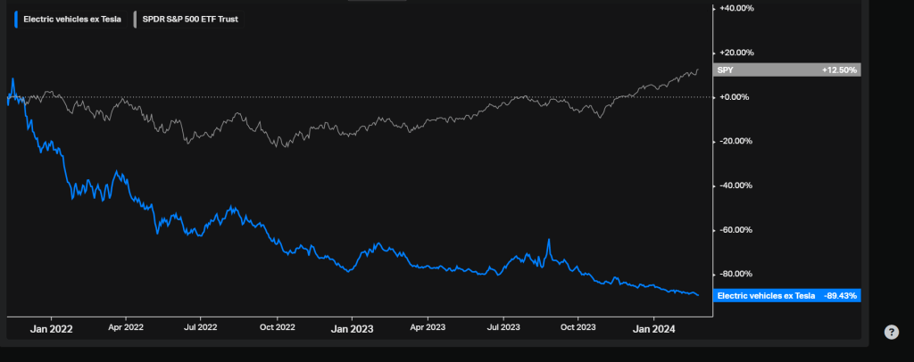 The reality of decelerating growth in cars sold in 2022 and 2023 punctured the electric vehicle story. When it became clear that sales would be limited to early adopters and that other categories of car buyers would prefer hybrids and gas powered vehicles, the investors’ disappointment was reflected in Tesla’s stock price.