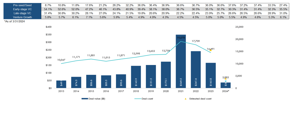 Tiger’s private companies have collapsed in value as well. Pre-money valuations of growth-stage ventures fell almost fifty percent in 2023.