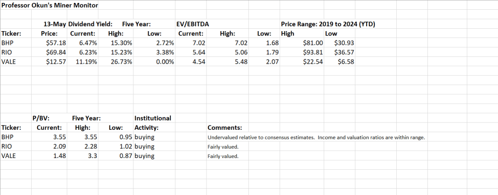 It is inevitable that minerals will become the dominant centenary trend of the natural resources world. There are short, intermediate and long-term sources of demand that will fuel this outcome. In September 2023, the Rabid Capitalist recommended investments in Rio Tinto (RIO), Vale (VALE) and BHP (BHP) as the most effective approach for taking advantage of these secular developments (see https://therabidcapitalist.com/2023/09/11/green-energy-it-is-easy-being-green/). These stocks have become more attractive over the last eight months.