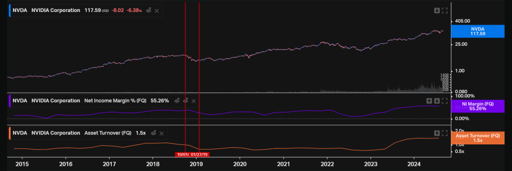 While the current Nvidia sell-off, that chopped approximately $200 billion off its market capitalization, illustrates this issue, there has been a starker example of investor disillusionment in the firm’s past. When Nvidia’s net margin and asset turnover declined by twenty-eight and thirty percent respectively between its third and fourth calendar quarter of 2018, its valuation collapsed by fifty percent as measured by its EV/EBITDA multiple.