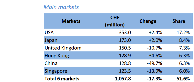 Asian consumers were not the only disappointment for the Swiss watch makers, based on a recent report from the Federation of the Swiss Watch Industry. Most markets suffered a notable decline in demand in September. The United Kingdom (-10.7%), Hong Kong (-34.6%), China (-49.7%) and Singapore (-13.9%) exceeded 80% of the global decline. Asia (22.6%) had the worst monthly performance, while Europe (3.4%) posted a modest decline. The United States (+2.4%) remained the sole bright spot, continuing to grow.